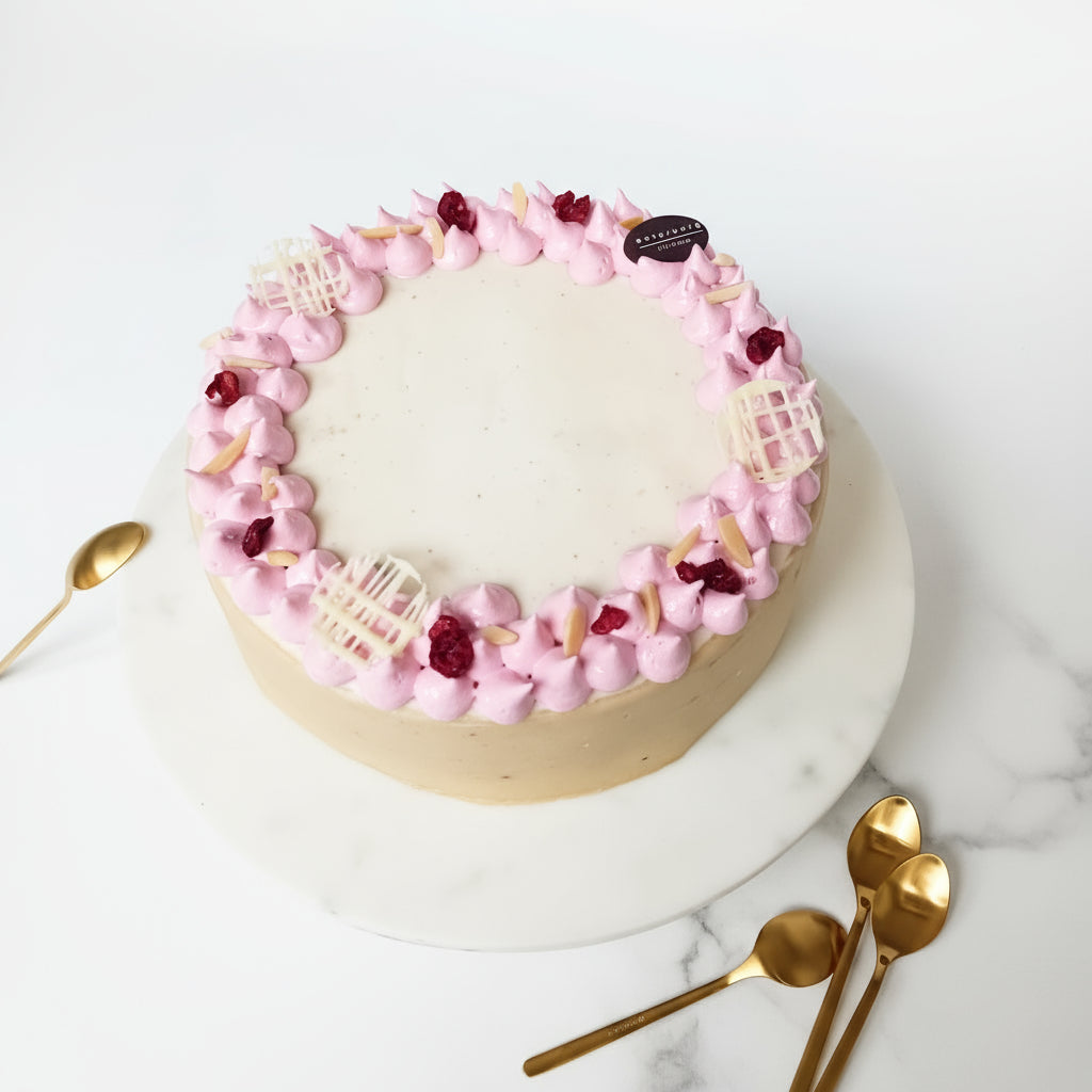 Pyntet med marcipanbånd, kirsebærmarengs mm.